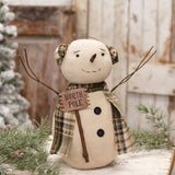 North Pole Snowman Doll is stuffed fabric with a green plaid scarf and cute puffed earmuffs. He has flexible wire arms with a "twig" look and an attached rustic wooden sign. Looks great with woodland themed Christmas decor! Has a weighted bottom for freestanding display and measures 11.5" tall with a 5.5" diameter, about 10" across including the arms.