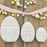 Set of three hand-drawn wood egg houses in your choice of white or stain finish