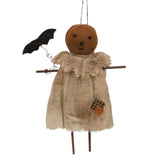 Plush pumpkin girl ornament with bat and fabric string for hanging