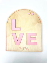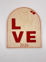 This timeless 3D Valentine keepsake features bold raised lettering spelling LOVE, accented with delicate heart details and a softly arched silhouette. Crafted from natural wood with dimensional red elements, this piece blends classic Valentine charm with a clean, modern feel.